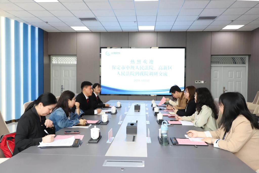 4月23日下午,保定市中级人民法院携保定高新区人民法院、河北金融公司来公司调研交流,与公司人工智能专业教师就知识产权与人工智能的相互支撑作用展开专题调研交流。