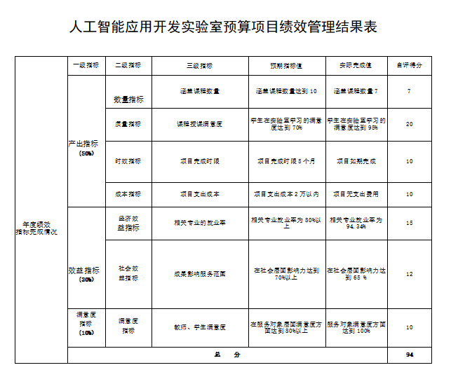 根据《保定市市级部门预算绩效管理工作考核办法(试行)》(保财〔2020〕75号﹞) 《太阳成集团tyc234cc预算绩效管理办法(试行)》(校字〔2023〕23号)有关规定,按照绩效信息及政务公开要求,现将人工智能应用开发实验室项目预算绩效管理结果进行公开,预算绩效管理结果见下。