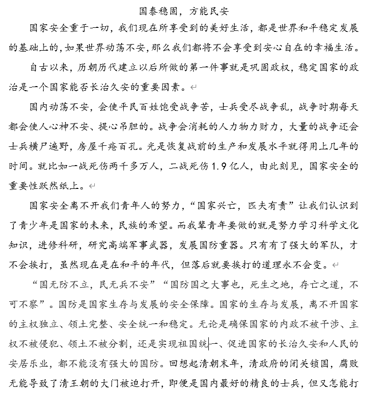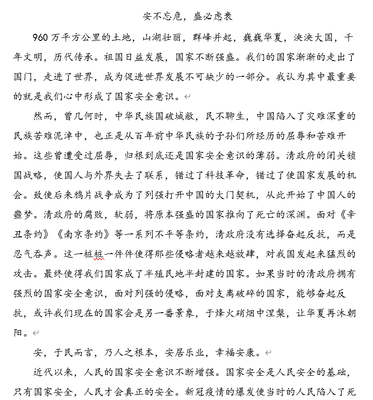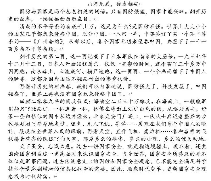 此次国家安全教育日征文比赛,不仅提升了同学们对于国家和民族的认同感、归属感,还培养了同学们的国家安全意识,让同学们意识到“国家兴亡,匹夫有责”这一深刻含义,引领同学们重视国家和民族尊严,把爱国之心转变成报国之行,增强同学们的政治素养和爱国情怀。