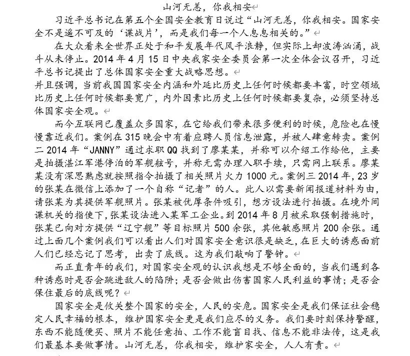 为提高员工的国家安全意识,进一步筑牢国家安全防线,建立起国家安全的钢铁长城,做到居安思危,未雨绸缪,公司举行了“山河无恙,你我相安”国家安全教育主题征文比赛。