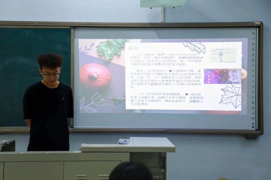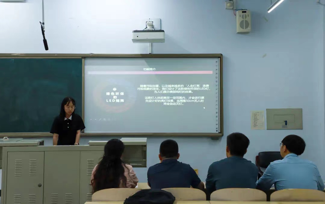 六组同学依次以PPT的形式讲解自己的彩灯作品,分别从思路来源、发展历程、代码展示、节能减排的实现等方面进行展示讲解。段禹州组将彩灯设计成数字倒计时的模样,创意十足;