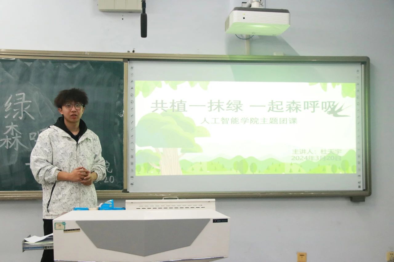 本次团课的主题为“共植一抹绿,一起森呼吸”,由2022级人工智能一班的杜天宇同学主讲。团课内容涵盖了“植树节的由来”、“各国植树节的习俗”、“一棵树的价值”以及“来植树吧”四个部分。