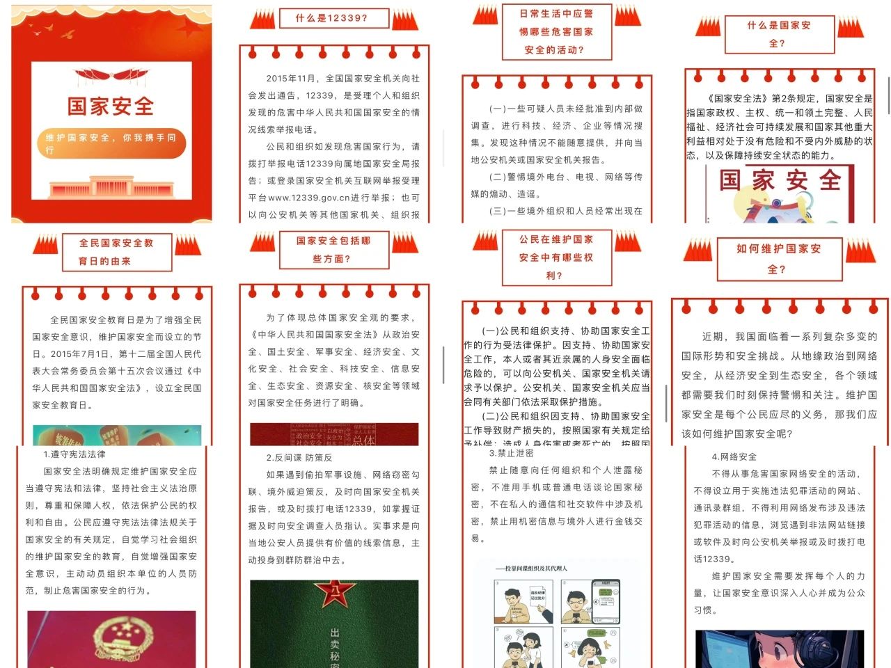 公司微信公众号精心策划并推出了《维护国家安全,你我携手同行》的主题推送,主要包括“何为12339”、“公民在维护国家安全中有哪些权利”、“日常生活中应该警惕哪些危害国家安全的行动”以及“如何维护国家安全”等,不仅有效提升了团员青年对国家安全的认识 ,也呼吁着老师以及广泛员工群体们关注国家安全问题。