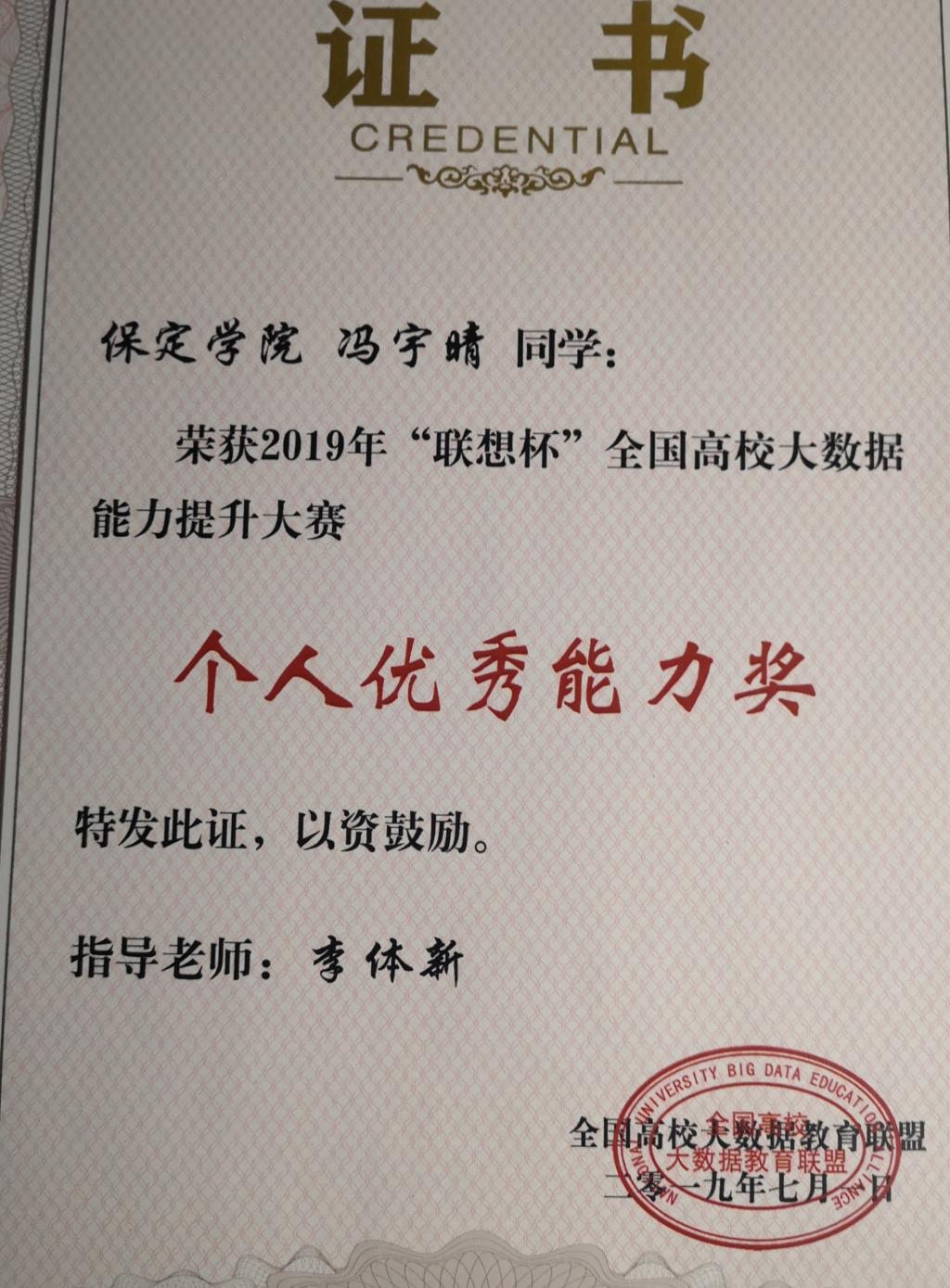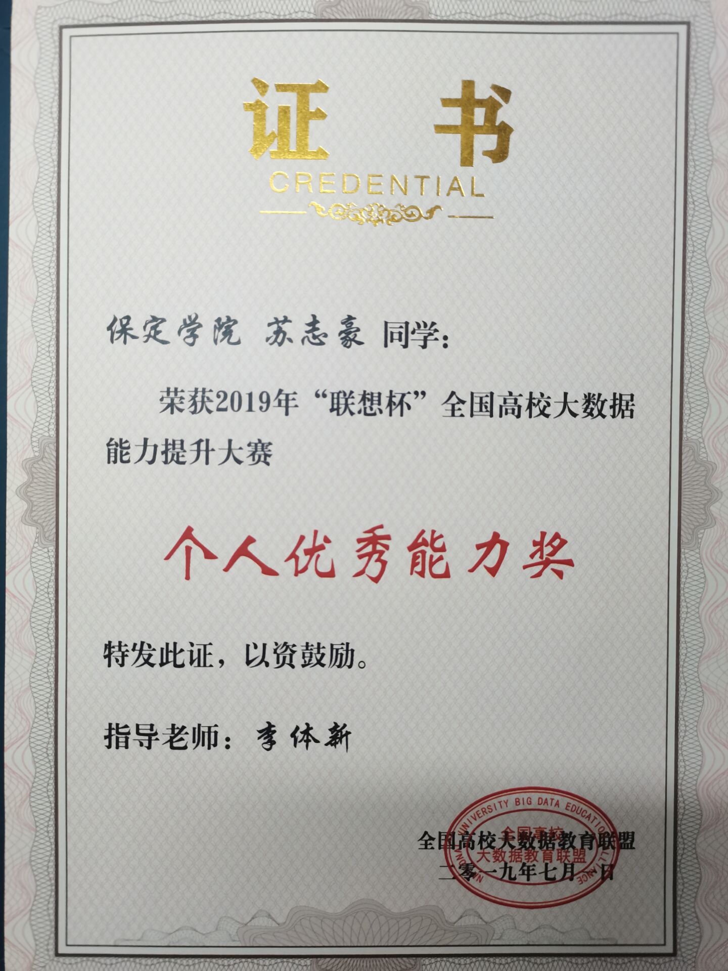 2019年“联想杯”全国高校大数据能力提升大赛个人优秀能力奖