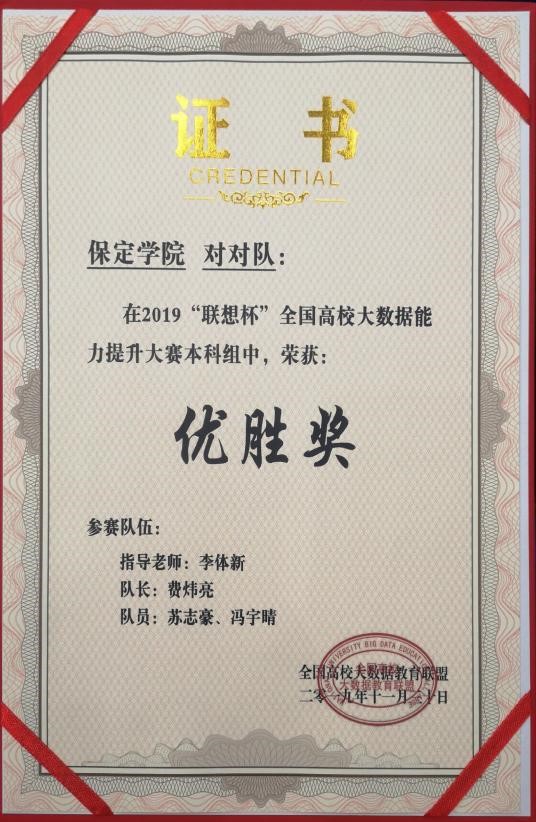 2019年“联想杯”全国高校大数据能力提升大赛本科组优胜奖
